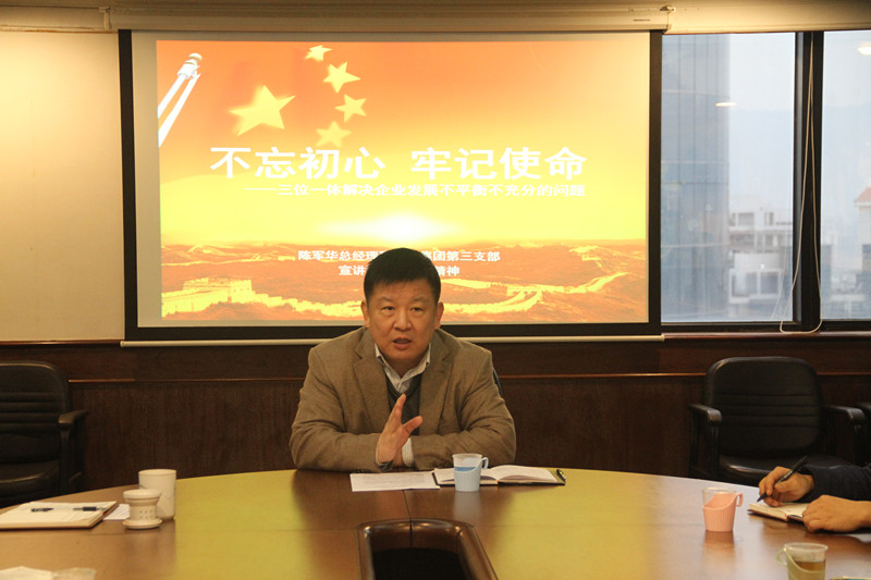 2017年12月18日下午,集團黨委副書記、總經(jīng)理陳軍華深入所在機關(guān)第三支部宣講十九大精神,陳軍華總經(jīng)理圍繞“不忘初心,牢記使命---三位一體解決企業(yè)發(fā)展不平衡不充分問題”主題上專題黨課,機關(guān)第三支部全體黨員干部和財務(wù)部、審計室員工參加了此次學(xué)習(xí)。