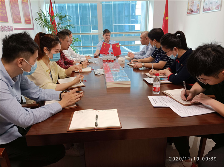 2020年11月19日上午,外貿集團黨委副書記游向陽到集團權屬鄉投公司為在崗黨員及發展對象就學習貫徹黨的十九屆五中全會精神講專題黨課并分發《習近平在福州》采訪實錄等書籍。