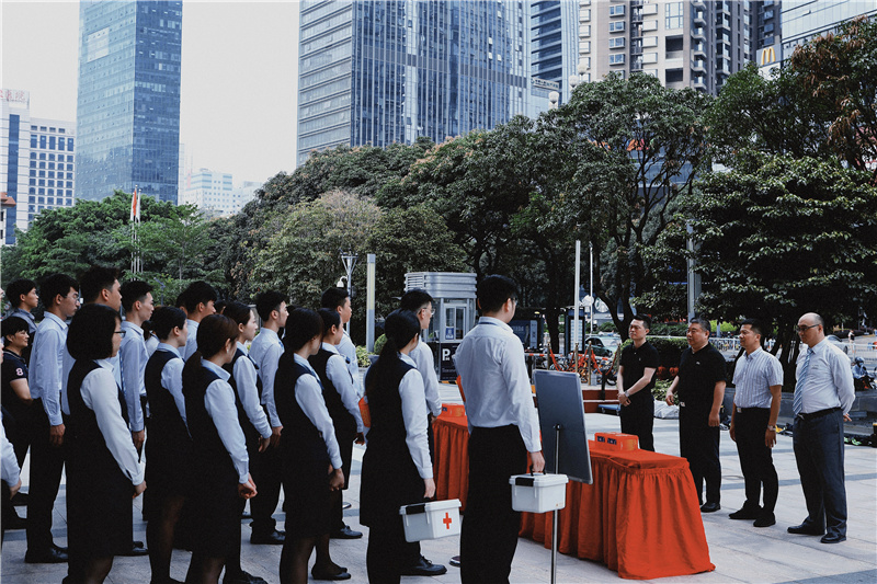 9點30分,演練正式開始。隨著大廈內消防警報響起,現場疏散有序進行。疏散組、救護組、滅火組,各部門分工明確,全力保障客戶與職工安全。疏散組將逃生人員引導至大廈西側廣場,現場緊張有序。5分鐘后,疏散結束,各單位職工于廣場集合,由安管員向大家演示了消防服穿戴及水帶連接,并詳細介紹了干粉滅火器及防毒面具的使用。在場各單位職工積極參與滅火實操體驗,掌握消防設備的正確使用方法。