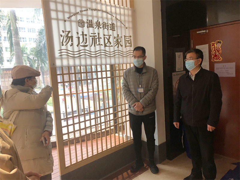 游向陽一行來到溫泉街道湯邊社區家園,實地查看了社區養老機構封閉管理的情況,并認真聽取工作人員關于疫情防控、老人照護、經營服務等相關情況的介紹。他強調,要切實按照所屬街道社區關于疫情防控的工作要求,嚴格遵從政府對疫情防控措施的安排,做好封閉管理的各項工作,確保居住老人的健康安全。要用心用情做好長者照護服務工作,加強醫療、餐飲、照護等服務項目,切實滿足居住老人的養老服務需求。